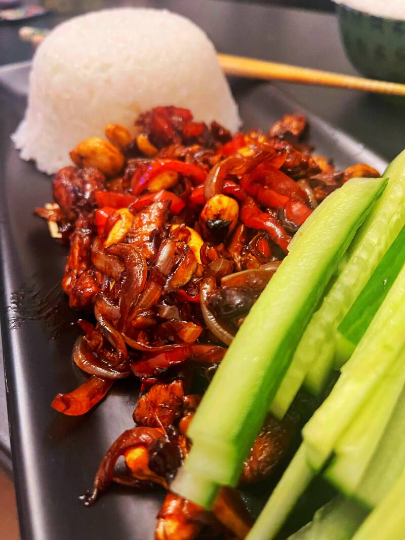 Snijd een witte ui in reepjes, 3 knoflooktenen in dunne plakjes, een rode peper in smalle ringen, hak 2cm gember in kleine stukjes en snijd een puntpaprika in ringen. Verhit wat sesamolie in een wok en voel de ui en knoflook toe. Bak tot het glazig is en voeg overige groenten toe. Doe er de inhoud van een pakje vegan kipstukjes (ik nam die van Vivera)bij en roerbak even flink. Doe er een scheut zoute soyasaus bij, 1tl bruine basterdsuiker, 1tl crispy chili olie en een klein beetje maizena om de saus te binden. Voeg een handje cashewnoten toe en bak nog een minuutje. Snijd een stuk komkommer in smalle reepjes, dit is een lekkere frisse tegenhanger👌🏽