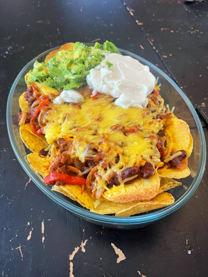 Bak vegan gehakt (ik nam die van beyond meat) in wat olijfolie, voeg de tacomix van Santa Maria toe met 100ml water, mix& bak het goed. Snijd een rode puntpaprika in ringen, een witte ui in reepjes en voeg beide toe. Ik nam een potje mexicaanse bonenschotel van Hak en voegde ook deze toe aan de pan. Even goed roeren en laten pruttelen, nacho’s in de ovenschaal, paninhoud eroverheen, vegan kaas naar keuze, even onder de grill en klaar is Klara!! Ik deed er nog avocado en een bekertje haverfraiche bij om het af te maken👌🏽