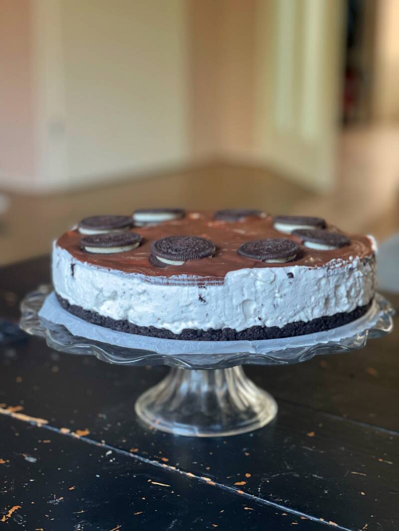 Smelt een reep handoff melkchocolade en voeg er een half theelepeltje kokosolie aan toe. Laat mooi dun smelten (niet te lang!!!). Verdeel het in streepjes over het mengsel (niet zoals ik deed, 2 hele repen als 1 dikke laag erbovenop 🤣) en leg 8 oreos op de taart, zo kun je mooi de grootte van de parten aanduiden. Zet nog even lekker in de koelkast (niet verplicht). En tadaaaaaa! Naar binnen harken, die handel!